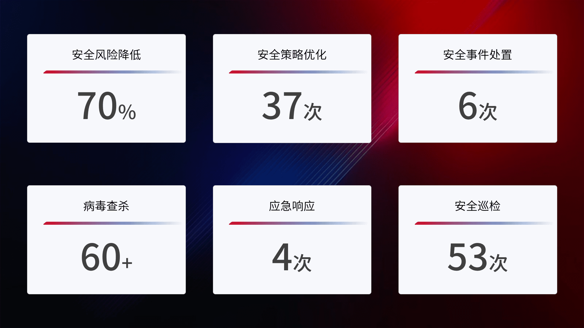 提供全面的安全事件报告体系,,包括处置报告、、周报、、、、季度和年度总结,,结合持续监控,,帮助客户深入了解网络安全状况。。。。