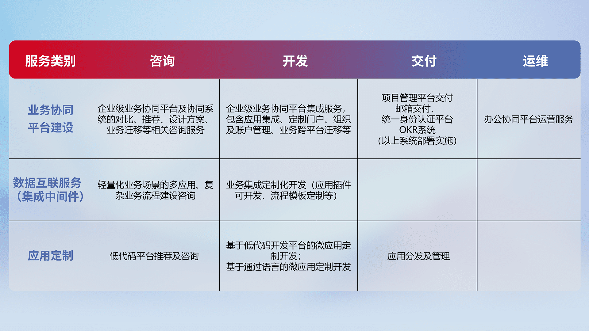 针对钉钉、、、企微、、、IDaas等平台级产品提供产品的规划、、、方案、、、、交付、、、定制化开发等服务,,,,实现如统一协同办公、、智能客户服务、、混合会议管理、、、智能数据查询、、、等业务场景,,,实现数字化转型。。